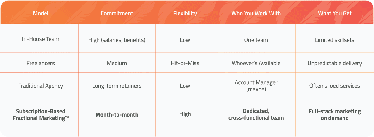 Let’s be real. The term "Subscription-Based Fractional Marketing™" didn’t exist until we coined it. That gives us a head start, and gives you the chance to work with the team that literally wrote the playbook. While others will scramble to catch up, you’ll already be ahead of the curve, working with the original experts who defined the model.